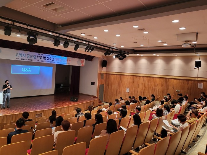 지난 7월에 실시한 대학입시설명회에서는 메가스터디 진로진학연구소 강사를 초청하여 ▲대입 흐름과 전공 트렌드 ▲23학년도 대입 일정 및 검정고시 대입 가능 전형 ▲대입 지원 시나리오 ▲참석자 대상 검정고시 가이드북 제공 등 학교 밖 청소년에게 필요한 맞춤형 정보를 제공했다. 또한 질의응답 시간을 통해 학교 밖 청소년과 부모의 궁금증을 해결하는 데 도움을 주었다.
