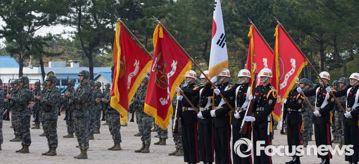 (제주도=포커스뉴스) 1일 오후 제주도 해병대 9여단 연병장에서 열린 창설식에서 해병대원들이 거수경례를 하고 있다.