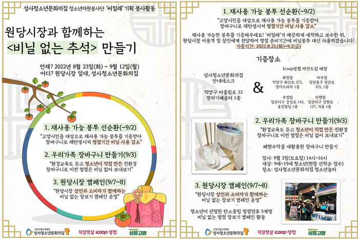 이런 과정을 거쳐 2022년 추석 명절기간 동안 원당시장에서 발생하는 비닐봉투를 줄여 탄소중립에 이바지하는 것이 ‘씨밀레’의 목표이다.