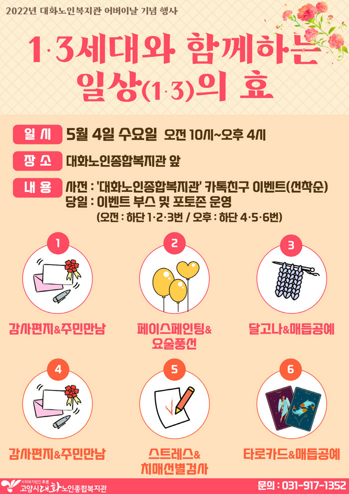 행사는 대화노인종합복지관을 주축으로 대화소망 어린이집, 고양시어린이집연합회, 재미공작소 등 지역사회 주민과 함께한다. 이번 행사는 3세대가 만나는 자리로, 선배시민은 어린이날을 축하하고, 아이들은 어버이 은혜를 생각하고 감사함을 전달하는 장이 될 예정이다.