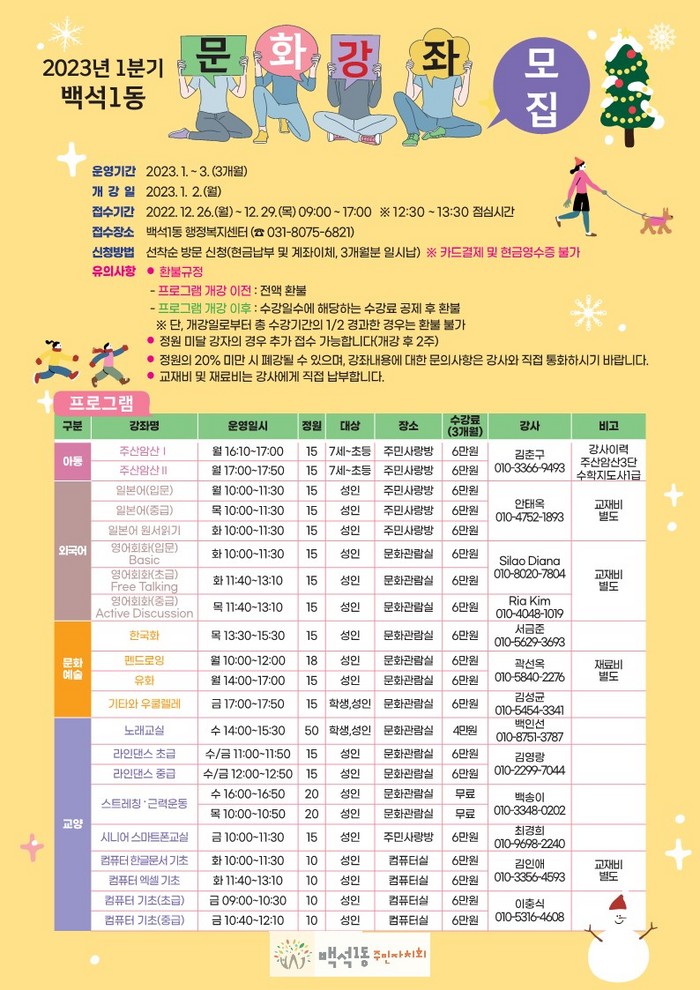 1분기 문화강좌는 내년 1월 2일부터 3개월간 진행되며, 12월 26일부터 12월 29일까지 백석1동 행정복지센터에서 선착순으로 신청 가능하다.