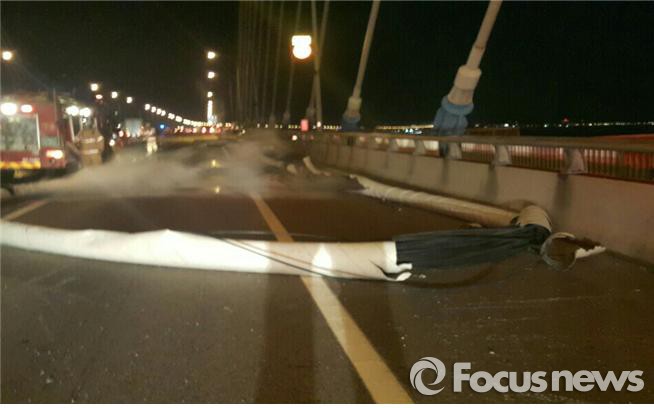 △ 지난 3일 오후 6시 12분 경기 평택시 서해대교 목포방면 행담도휴게소 전방 주탑에 불이 나 연결된 케이블이 끊어져 도로에 떨어져