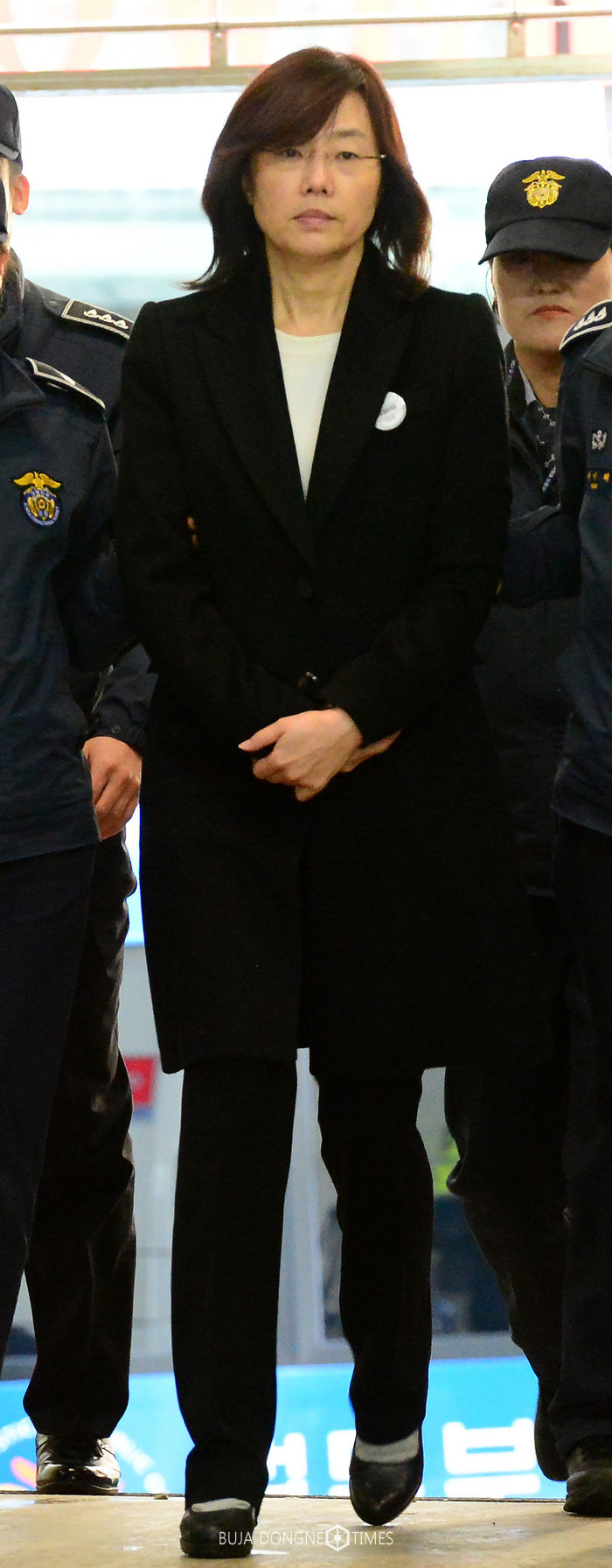 문화계 블랙리스트' 작성에 관여한 혐의로 구속된 조윤선 전 문화체육관광부 장관이 22일 서울 강남구 대치동 박근혜 정부의 최순실 등 민간인 국정농단 사건 수사 특별검사팀' 사무실로 소환되고 있다.