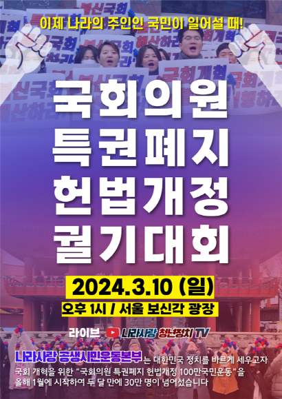 나라사랑공생시민운동본부(상임대표 박태현)가 '국회의원 특권폐지를 위한 헌법개정 100만 궐기대회'를 오는 10일 오후 1시부터 서울 종로구 보신각 앞 광장에서 진행한다.