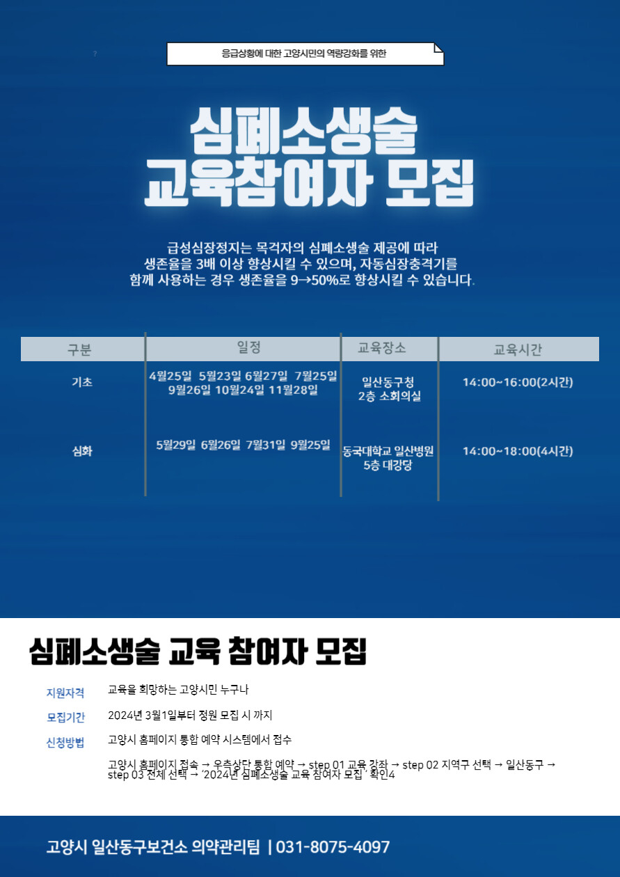 심폐소생술 교육 관련 보다 자세한 사항은 일산동구보건소 의약관리팀(☎031-8075-4097)으로 문의하면 된다.