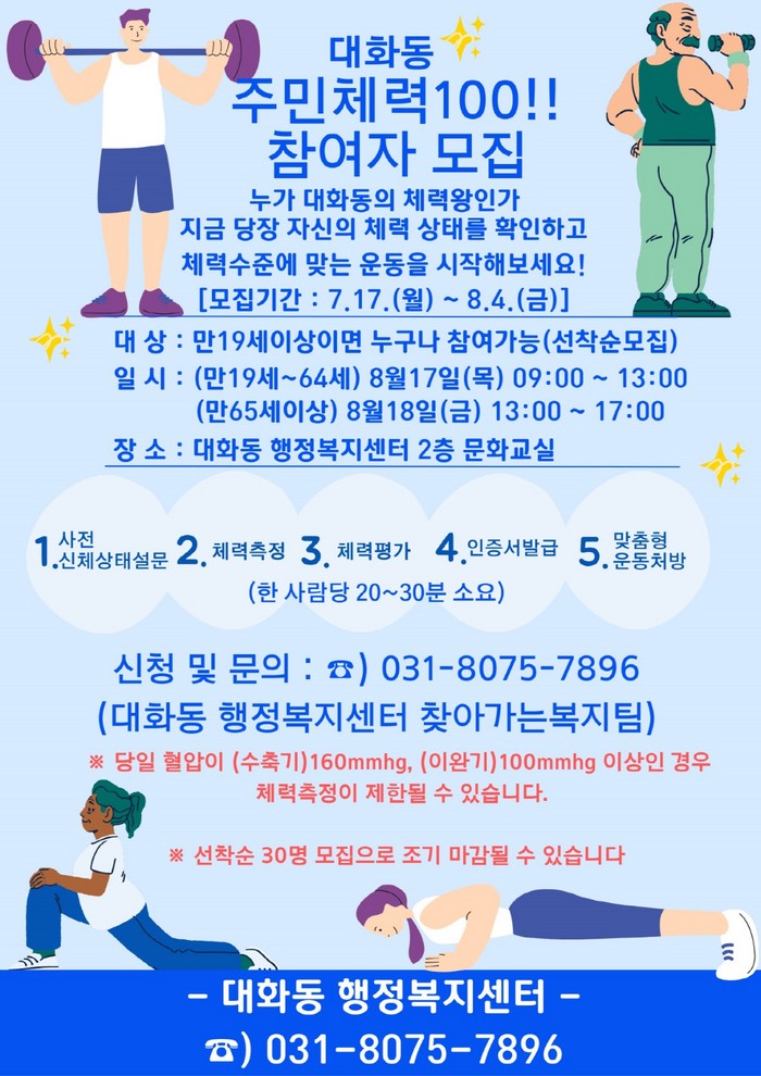 [부자동네타임즈 김인수기자] 고양특례시 대화동 행정복지센터는 주민들의 체력관리를 위한‘대화동 주민체력100’의 신청자를 모집한다고 18일 밝혔다.