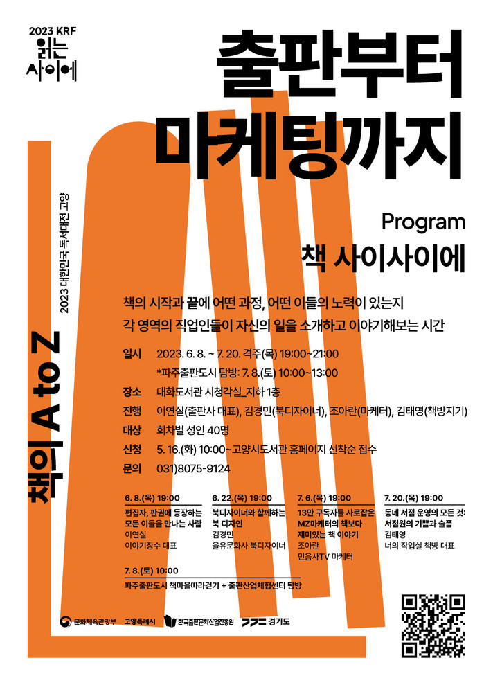 [부자동네타임즈 김인수기자] 고양특례시(시장 이동환)는 대한민국 독서대전 개최를 기념해 오는 6월 8일 강연 프로그램 책의 A to Z: 출판부터 마케팅까지를 운영한다.
