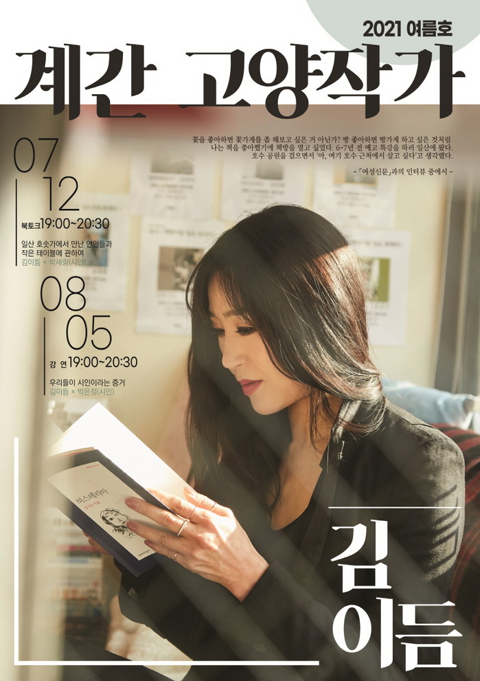 [부자동네타임즈 김인수기자] 고양시 아람누리도서관이 계절마다 새로운 고양시의 작가를 소개하는 계간 고양작가 여름편을 진행하고 있다. 오는 8월 5일에는 김이듬 시인을 초청한다.