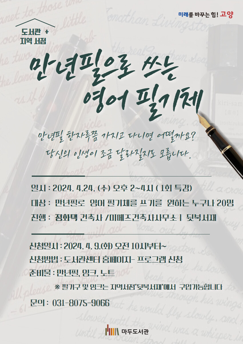 본 프로그램은 만년필을 사랑하고 영어 필사에 관심 있는 고양시민 누구나 참여가 가능하며, 사각사각 소리와 함께 만년필의 매력을 알아보고 쓰기와 그리기에 대한 생각, 필사의 맛과 기록의 습관을 함께 가질 수 있도록 도와주는 것이 목표이다.
