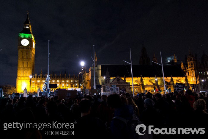 | △ (런던/영국=게티/포커스뉴스) 2일(현지시간) 영국 런던의 의회광장에 모인 사람들이 '시리아 공습 반대' 반전 시위를 벌이고 있다. 이날 영국 의회는 장기간 토론 끝에 찬성 397표, 반대 223표로 시리아 내 IS 공습안을 가결했다. ⓒ게티이미지/멀티비츠 photo@focus.kr |