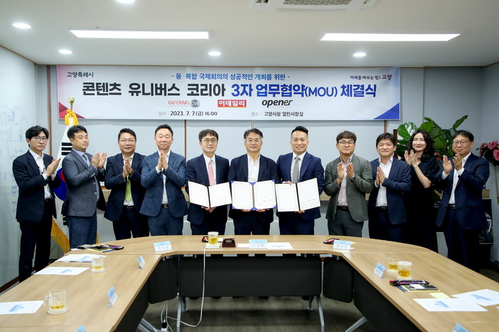 [부자동네타임즈 김인수기자] (사)고양컨벤션뷰로(이사장 이동환)는 지난 7일 고양시청 열린시장실에서 이데일리(주), 오프너디오씨(주)와 함께 융·복합 국제회의 ‘콘텐츠 유니버스 코리아’의 성공적인 개최를 위한 업무협약(MOU)을 체결했다.