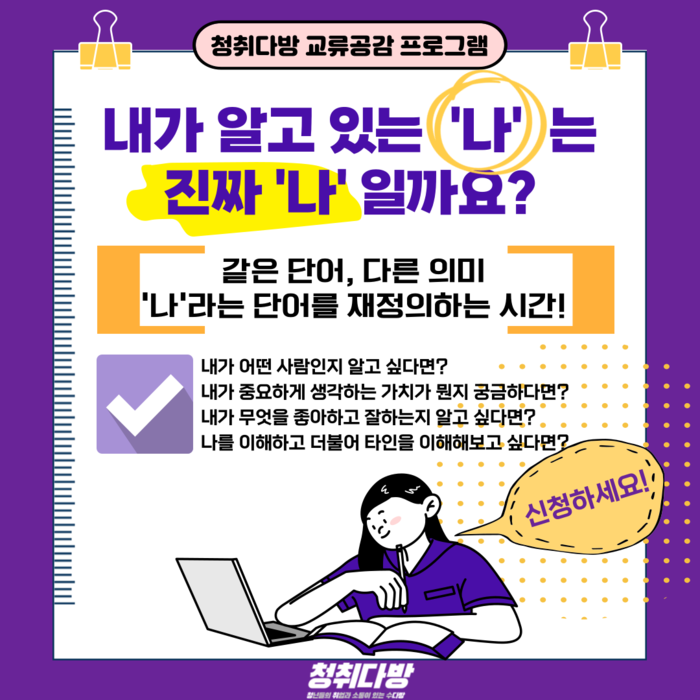 청취다방 관계자는 “마음건강 사각지대에 놓여 있는 청년들을 위하여 1:1 심리 상담 틀에서 벗어나 워크숍 형태로 구성했다. 청년들이 워크숍을 통해 자기 자신을 찾아가길 바란다.”라고 밝혔다.