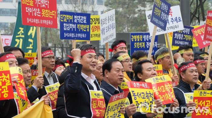 (세종=포커스뉴스) 20일 오전 세종시 정부세종청사 기획재정부 앞에서 강원도 선출직들과 도민들이 집회를 갖고 춘천∼속초 동서고속철도 사업의 조속한 이행을 촉구하고 있다.