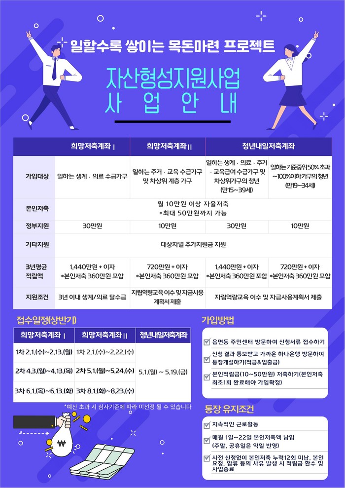 시 관계자는 “취약계층이 자산형성 지원사업을 통해 목돈을 마련하고, 이를 발판 삼아 나은 미래로 나아가길 바란다”고 말했다.
