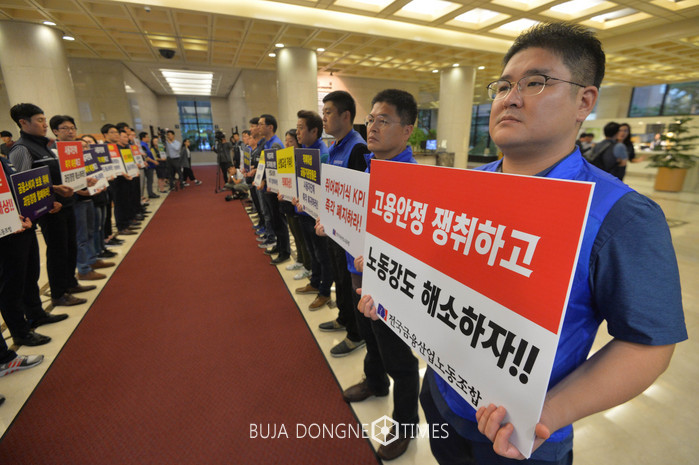28일 오후 서울 중구 은행연합회관에서 열릴 전국은행연합회 이사회에 시작에 앞서 전국금융산업노조 조합원들이 산별 교섭 및 고용 안정을 촉구하는 피켓 시위를 벌이고 있다. 2017.08.28.