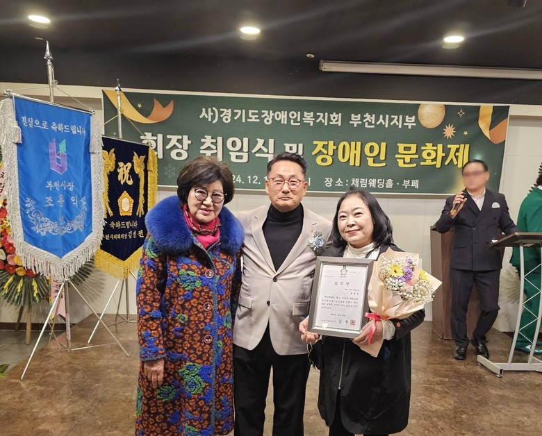 1년 한 해 봉사한 공로를 인정받은 신천지자원봉사단 부천지부(지부장 김규찬·이하 부천지부)가 지난 19일 부천 채림웨딩홀에서 열린 ‘2024년 경기도장애인복지회 부천시지부 회장 취임식 및 장애인 문화제’에서 부천지부 김태연 총괄이 대표로 부천시의회 의장으로부터 표창을 받았다.