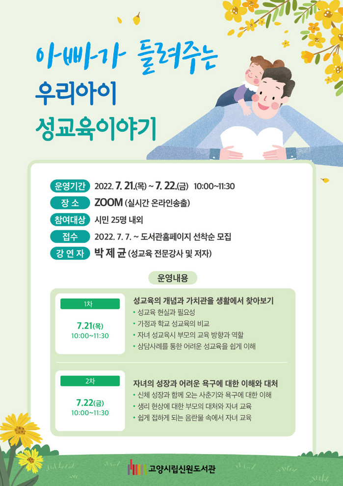 [부자동네타임즈 김인수기자] 고양특례시(시장 이동환) 신원도서관이 오는 21일(목)과 22일(금) 시민 30명을 대상으로 ‘아빠가 들려주는 우리아이 성교육’을 운영한다.