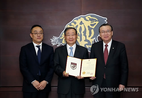 △ (서울=연합뉴스) 2일 오후 서울 성북구 고려대학교에서 황영(가운데), 황창원(왼쪽)씨가 학교발전기금을 기부한 뒤 김병철 총장과 기념촬영을 하고 있다. 고 황진규씨와 아들 황영씨, 손자 황창원씨까지 3대에 걸친 가족이 고려대에 기부를 해온 것은 이번이 처음이다. 2015.2.2 << 고려대학교 제공> photo@yna.co.kr