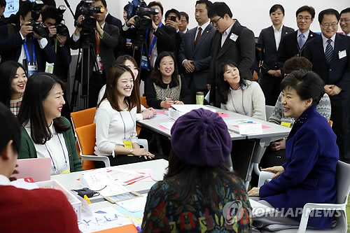 △ 충북창조경제센터 둘러보는 박 대통령 (청주=연합뉴스) 도광환 기자 = 박근혜 대통령이 4일 오전 충북 청주시 오송읍 충북지식산업진흥원에서 열린 충북창조경제혁신센터 출범식에서 마케팅 기획 실습실을 방문해 참석자들과 이야기를 나누고 있다. 2015.2.4 dohh@yna.co.kr