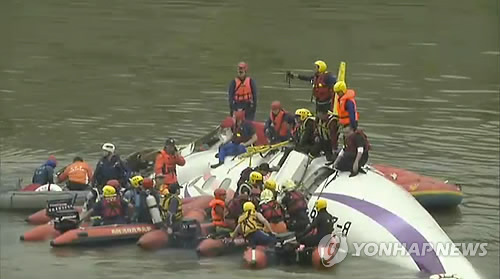 | △ 타이베이서 여객기 하천 추락…최소 9명 사망 (AP=연합뉴스) 승객과 승무원 58명을 태운 대만 푸싱항공의 국내선 여객기가 4일(현지시간) 타이베이에서 이륙한 직후 공항 인근 고가도로를 들이받고 하천으로 추락, 최소 9명이 사망했다. 사진은 하천에 빠진 여객기 주변에서 구조작업이 벌어지고 있는 모습. |