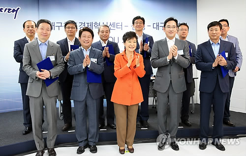 △ 창조경제혁신센터 확대 출범식 기념촬영 (대구=연합뉴스) 도광환 기자 = 박근혜 대통령이 15일 오전 대구 무역회관에서 열린 창조경제혁신센터 확대 출범식에 참석, 삼성과 벤처기업 간 계약 체결식을 지켜본 뒤 이재용 삼성전자 부회장, 벤처기업 대표들, 권영진 대구시장 등과 기념촬영하며 박수치고 있다. 2014.9.15 dohh@yna.co.kr