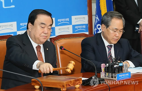 △ (서울=연합뉴스) 진성철 기자 = 새정치민주연합 문희상 비상대책위원장(왼쪽)이 6일 국회에서 마지막으로 확대간부회의를 주재하고 있다.