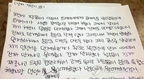 △ 트레이너의 여고생 성추행 사건 진술서 (의정부=연합뉴스) 경기지역의 한 고교 운동부에서 여학생들을 상습 성추행한 혐의로 트레이너를 붙잡아 조사중이라고 경찰은 9일 밝혔다. 트레이너는 여학생에게 자신의 다리를 '오일마사지'하라고 하는 등 상습 성추행한 혐의를 받고 있다. 사진은 피해 여학생 학부모 측에서 공개한 학생이 쓴 진술서. 2015.2.9 suki@yna.co.kr
