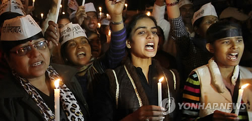 △ 인도 반부패신당 아마드미당(AAP) 지지자들이 지난해 12월 8일(현지시간) 뉴델리에서 ‘우버’ 승객 성폭행 사건에 항의하는 시위를 벌이고 있다. (EPA=연합뉴스)