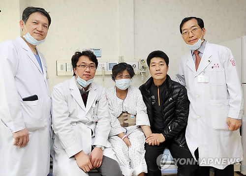 △ 아내에게 간 기증한 남편 (대구=연합뉴스) 지난달 13일 대구 계명대학교 동산의료원에서 남편 김완수(45·오른쪽 두 번째)씨가 간경변증을 앓는 아내 이윤연(47·가운데)씨를 위해 자신의 간 반 이상을 내줬다. 사진은 지난 2일 김씨부부가 의료진과 기념촬영 모습. 2015.2.9 <<동산의료원 제공>> sunhyung@yna.co.kr