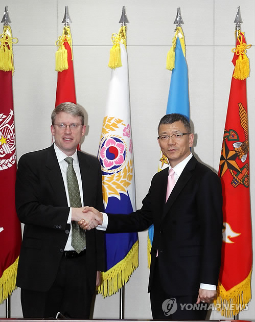△ 한·미 통합국방협의체 회의 (서울 사진공동취재단=연합뉴스) 17일 서울 용산구 국방부에서 열린 제6차 한·미 통합국방협의체(KIDD)회의에서 한국측 대표 류제승 국방정책실장(오른쪽)과 미국측 대표 데이비드 헬비 동아시아부차관보가 악수하고 있다. 2014.9.17 photo@yna.co.kr