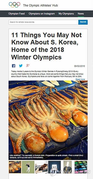 10일 올림픽 선수 허브 사이트(hub.olympic.org)를 보면 '2018 평창동계올림픽 개최지 한국에 대해 당신이 몰랐을 만한 11가지'라는 제목의 게시물이 산낙지 등 사진과 함께 올라와 있다.