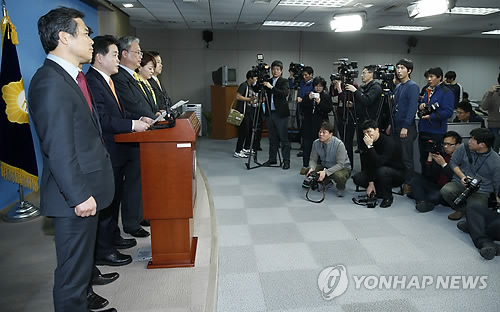 △ 총리후보자 언론회유 의혹 관련 기자회견 (서울=연합뉴스) 이상학 기자 = 국무총리 후보자 인사청문특위 새정치민주연합 유성엽 간사와 위원들이 10일 국회 정론관에서 이완구 총리 후보자의 언론회유 의혹 관련 기자회견을 하고 있다.