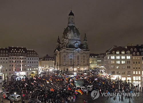 | △ 독일 반이슬람 단체, 월요집회 재개 (AP=연합뉴스) 지도부 줄사태로 최근 월요집회를 중단해 온 독일의 반(反)이슬람 운동단체 '유럽의 이슬람화를 반대하는 애국적 유럽인들'(PEGIDA·페기다)이 9일(현지시간) 독일 드레스덴의 프라우엔키르헤 성당 앞에서 다시 집회를 열고 있다. |