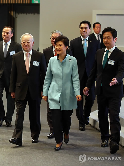 △ 문화창조융합벨트 출범식 (서울=연합뉴스) 도광환 기자 = 박근혜 대통령이 11일 오전 서울 마포구 상암동 CJ E&M센터에서 열린 문화창조융합벨트 출범식에서 손경식 CJ 회장 등과 함께 행사장에 입장하고 있다.