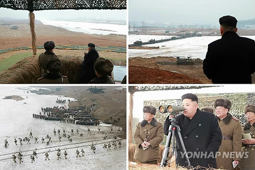 | △ 도하훈련 참관하는 김정은 (서울=연합뉴스) 북한군이 김정은 북한 국방위원회 제1위원장의 참관 하에 동계 도하공격훈련을 실시했다. 노동신문이 27일 게재한 관련 사진에는 김 제1위원장이 간부들을 거느리고 훈련을 지켜보는 모습이 담겼다. 2015.1.27 nkphoto@yna.co.kr |