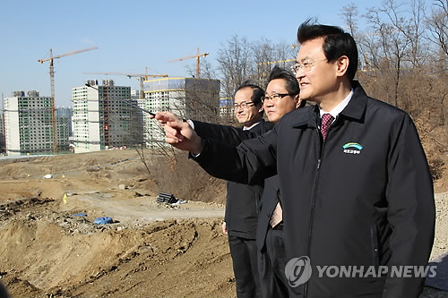 | △ 뉴 스테이 위례신도시 용지 현장 방문한 서승환 장관 (서울=연합뉴스) 서승환 국토교통부 장관이 12일 오후 경기 성남시 수정구 LH 한국토지주택공사 '뉴 스테이'(기업형 민간임대주택) 사업 부지를 방문, 공사 관계자로부터 사업 관련 설명을 듣고 있다. 2015.2.12 << 국토교통부 제공 >> photo@yna.co.kr |