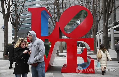 | △ 신주쿠 명물 'LOVE' 조형물과 함께한 연인 (AP=연합뉴스 자료사진) |