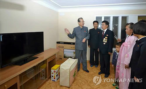 △ (서울=연합뉴스) 작년 10월 평양 위성과학자주택지구에 입주한 과학자 가족들과 대화하는 최태복 최고인민회의 의장(사진 가운데 잿빛 옷을 입은 사람). 노동신문 사진. <<자료사진>>