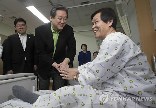 △ 보훈병원 찾은 김무성 대표 (서울=연합뉴스) 윤동진 기자 = 새누리당 김무성 대표가 설 명절을 앞두고 15일 오후 서울 강동구 중앙보훈병원을 방문해 국가유공자를 위문하고 있다.