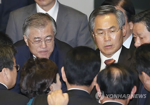 △ 임명동의안 가결 대화하는 새정치민주연합 (서울=연합뉴스) 이상학 기자 = 새정치민주연합 문재인 대표와 우윤근 원내대표 등이 16일 국회에서 열린 제331회 국회 (임시회) 제4차 본회의에서 이완구 국무총리 후보자 임명동의안이 가결된 뒤 대화를 하고 있다.