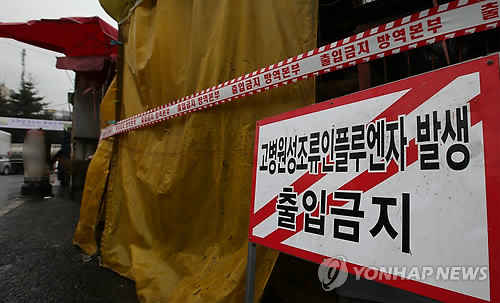 | △ AI 양성반응 확인된 닭 판매업소 (울산=연합뉴스) 김용태 기자 = 고병원성 AI(조류인플루엔자)양성반응이 확인된 울산시 남구 상개동의 닭 판매업소 주변에 16일 오전 출입금지 표지판이 설치돼 있다. 울산시 남구는 업소에서 보유 중인 닭 164마리를 모두 살처분했다고 이날 밝혔다. 2015.2.16 yongtae@yna.co.kr |