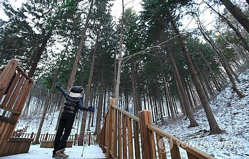 △ (서울=연합뉴스) 성연재 기자 = 길다면 길고 짧다면 짧은 5일 설 연휴. 바로 귀경하지 않고 경로상 여행을 즐기려는 사람들이 늘고 있다. 이미 만석이 된 휴양림은 트레킹만 즐기고 인근에서 숙박하며 즐길 수 있다. 사진은 겨울 정취 가득한 덕유산 독일가문비나무 군락지 트레킹. 2015.2.18 polpori@yna.co.kr