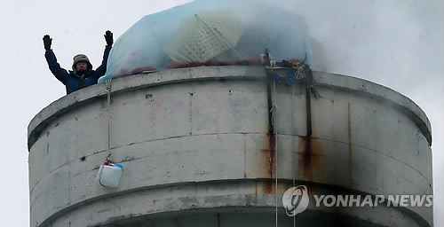 | △ 70m 굴뚝에서 설 맞이하는 쌍용차 해고노동자 (평택=연합뉴스) 신영근 기자 = 설 연휴를 하루 앞둔 17일 오전 경기도 평택 쌍용자동차 평택공장 70m 높이 굴뚝에서 해고자 복직 문제 해결을 위해 고공 농성중인 금속노조 쌍용차지부 김정욱 사무국장이 공장 밖 동료에게 손을 흔들고 있다. 김 국장과 함께 농성중인 이창근 정책기획실장 등은 오는 19일 퇴거 단행을 앞두고 해고자 문제 해결 없이는 굴뚝 아래로 내려오는 일은 없을 것이라고 밝혔다. 2015.2.17 drops@yna.co.kr http://blog.yonhapnews.co.kr/geenang |