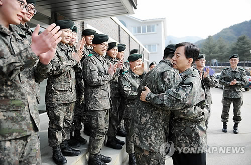| △ 장병 격려하는 한민구 국방장관 (서울=연합뉴스) 한민구 국방부 장관이 설 연휴 기간중인 20일 중부전선의 예하대대를 방문해 장병들을 격려하고 있다. 2015.2.20 << 국방부 제공 >> jjaeck9@yna.co.kr |