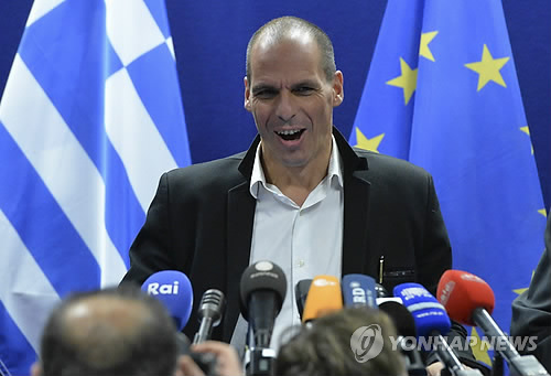 △ 20일(현지시간) 벨기에 브뤼셀에서 야니스 바루파키스 그리스 재무장관이 기자회견을 하고 있다. (EPA=연합뉴스)