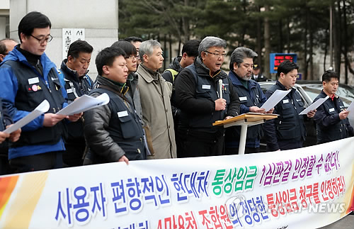 △ 현대차 노조, 통상임금 소송 항소장 제출 (서울=연합뉴스) 신준희 기자 = 29일 오전 서초동 서울고등법원 앞에서 금속노조 현대자동차지부 조합원들이 '사용자 편향적인 통상임금 1심판결은 인정할 수 없다'며 항소장 제출 기자회견을 하고 있다. 2015.1.29 hama@yna.co.kr
