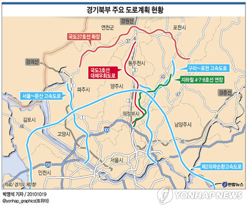 | △ <그래픽> 경기북부 주요 도로계획 현황 (서울=연합뉴스) 박영석 기자 = 19일 경기도 제2청 자료. 제2외곽순환고속도로 및 국도3호선 대체우회도로 등 경기북부 주요 도로계획 현황. zeroground@yna.co.kr @yonhap_graphics(트위터) |