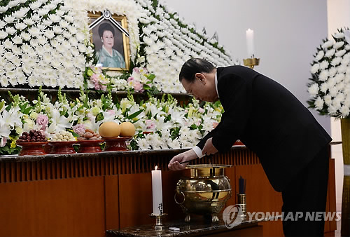 △ 조문하는 김기춘 실장 (서울=연합뉴스) 김수진 기자 = 김기춘 청와대 비서실장이 22일 서울 아산병원 장례식장에 마련된 김종필 전 총리의 부인 박영옥씨 빈소를 찾아 분향하고 있다. ksujin@yna.co.kr