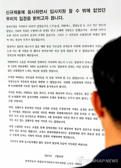 △ 현대차 울산공장에 붙은 대자보 (울산=연합뉴스) 현대차 울산공장 사내 게시판에 정규직화 투쟁을 접겠다는 비정규직 조합원의 대자보가 24일 게재됐다. 2015.2.24 << 현대차 제공 >> canto@yna.co.kr
