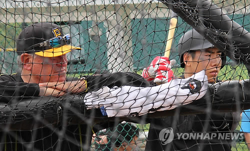 | △ 허들 감독과 강정호 (브래든턴<미국 플로리다주>=연합뉴스) 장현구 특파원 = 미국프로야구 피츠버그 파이리츠의 강정호가 24일(현지시간) 스프링캠프인 미국 플로리다주 브래든턴의 파이리트 시티에서 타격 훈련을 지켜보는 클린트 허들 감독 옆에서 스윙을 하고 있다. |